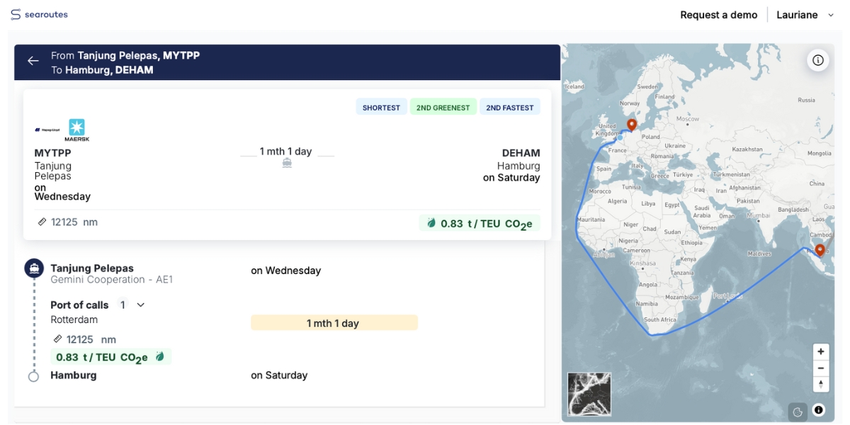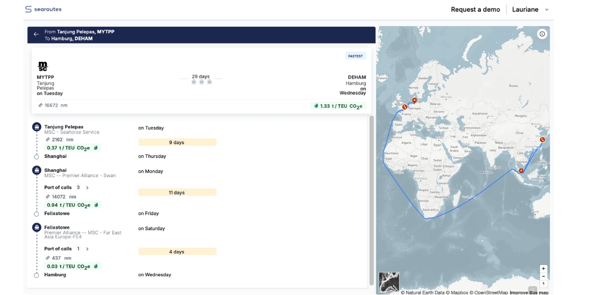 Let’s break down two examples from the Searoutes data for a Asia to Europe Transport: